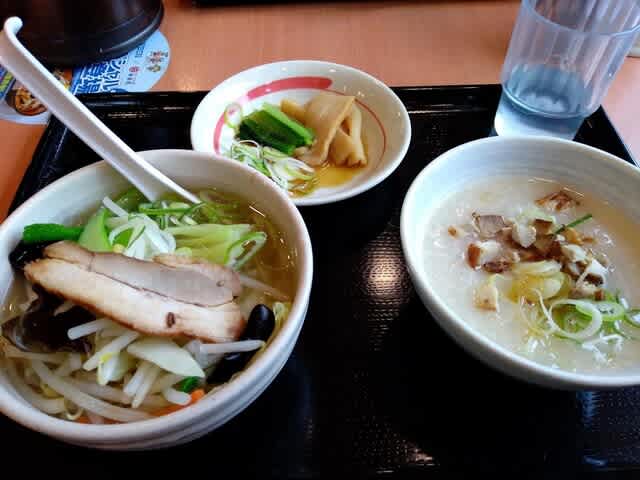 2020-12-18 幸楽苑の朝定食 ラーメン いつもの温泉&お出かけ仲間と出かける日。 前夜に友人が幸楽園で朝定食を食べよう!と電話。 彼女は先日食べてとても美味しかったと言う。 8時に待ち合わせしてお店に一番乗り。開店直後でまだ暖まっていない。 メニュー見て考える。 ハーフお粥・おひたし・ハーフ野菜ラーメンのBセット、500円也。 到着するまで時間がかかったが、一人でやってらっしゃるから致し方ない。 寒い朝はお粥が美味しい。ハーフラーメンいただくよ。このお店にはほとんど来ないがラーメンも美味しい。